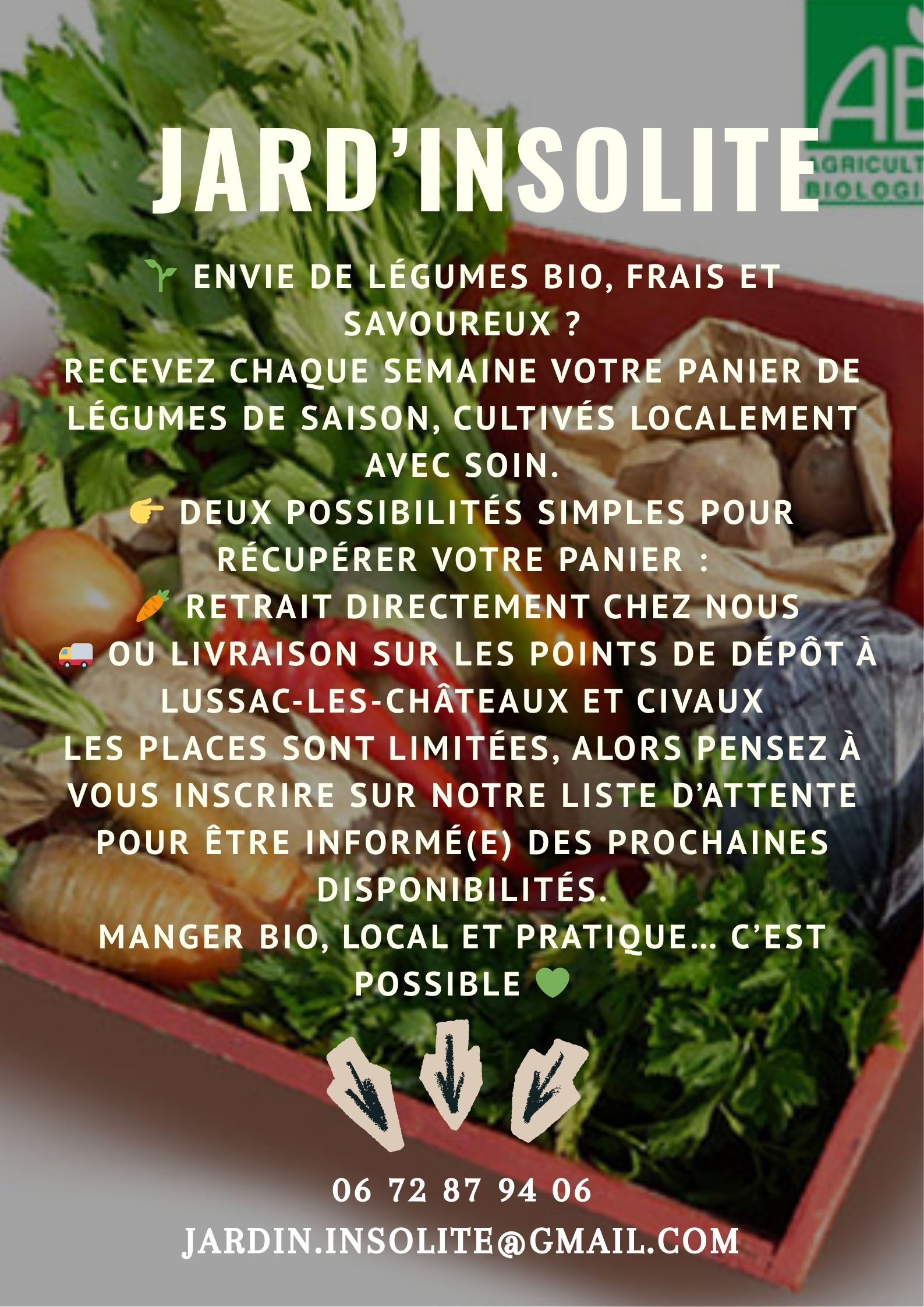Recevez chaque semaine votre panier de légumes de saison, cultivés localement avec soin. 👉 Deux possibilités simples pour récupérer votre panier : 🥕 Retrait directement chez nous 🚚 ou livraison sur les points de dépôt à Lussac-les-Châteaux et Civaux Les places sont limitées, alors pensez...